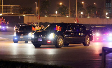 Đoàn xe chở tổng thống Hoa Kỳ rời sân bay Nội Bài, lăn bánh trên đường phố Việt Nam