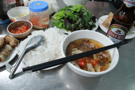 Suất bún chả của Tổng thống Mỹ Obama không khác gì các thực khách khác. Ông đã ăn hết 2 suất bún chả, kèm với nem, uống một chai bia Hà NộiẢnh: Lê Nam