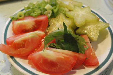 Bước 2: Các loại nguyên liệu khác rửa sạch. Các loại rau thơm, gừng, hành thái nhỏ. Khế gọt bỏ riềm, thái miếng mỏng hình sao. Cà chua thái múi cau.