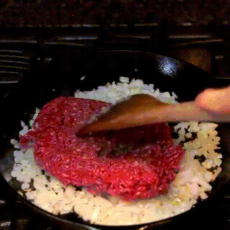 - Lớp thứ 2 bạn xếp tiếp một miếng mì tròn rồi đến nhân thịt bò.