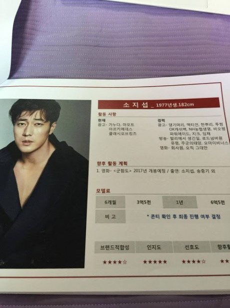 6 tháng: 400 triệu won (7,8 tỉ đồng) 1 năm: 700 triệu won (13,6 tỉ đồng) Mức phù hợp thương hiệu: 4 sao Sự phổ biến: 5 sao Độ yêu thích: 4 sao