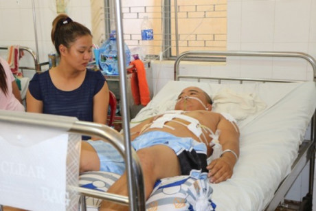 Anh Lê Văn Tài đang được chăm sóc sau khi được mổ cấp cứu với những vết đâm chi chít trên cơ thể.
