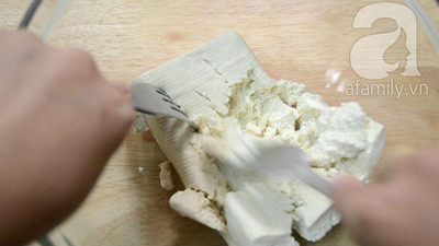 Rửa đậu phụ, để khô (hoặc lấy khăn giấy thắm khô). Cho vào tô dằm nhuyễn.