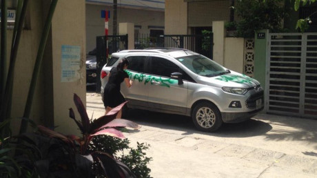 Trên nắp capô có dòng chữ "Đỗ xe ngu thế". Trong đó, sơn dính cả vào chóa đèn pha bên trái. Ở bên sườn xe là dòng chữ "Cấm đỗ xe trước cổng", dính lên cả kính cửa sổ.