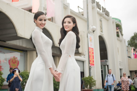 Trong những ngày ở Việt Nam công tác, Hoa hậu Pháp Flora Coquerel được Kỳ Duyên đưa đi thăm những điểm nổi tiếng ở TP HCM. Cả hai chọn áo dài trắng, xuất hiện trên phố đông người.