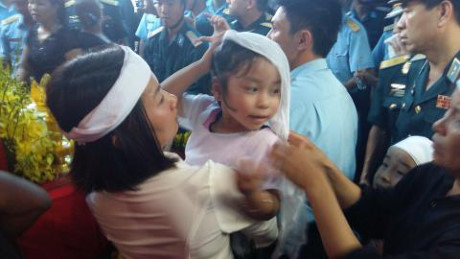 Con gái Đại tá, phi công Trần Quang Khải năm nay mới chỉ hơn 3 tuổi, nỗi đau mất cha dường như em chưa hiểu được. ''Cha đang bay trên bầu trời xanh thẳm. Em vẫn cười, vội tháo tấm khăn tang...''