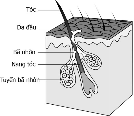 Các tuyến sản xuất ra bã nhờn (tạm gọi là tuyến bã nhờn) nằm ngay dưới chân tóc, ở lớp hạ bì (dưới da). Bã nhờn sẽ đi theo các nang lông, chạy dọc theo chân tóc qua da đầu của bạn.