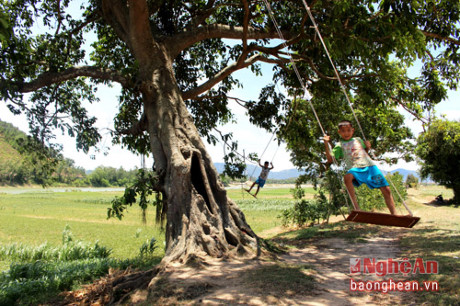 Những chiếc đu làm từ ván gỗ và dây dù bền chắc đã làm cho cây đa như có thêm sức lôi cuốn.