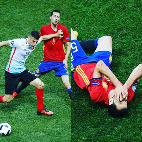 Phút thứ 9 trong trận đấu giữa Tây Ban Nha vs Thổ Nhĩ Kỳ ở EURO 2016 đêm qua, Busquets lao vào tranh bóng với Yilmaz. Tiền đạo của Thổ Nhĩ Kỳ đã đưa tay ra ngăn cản tiền vệ người Tây Ban Nha.