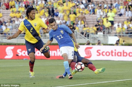 Tình huống Coutinho (áo xanh) dứt điểm cận thành nhưng không thắng được thủ môn của Ecuador.