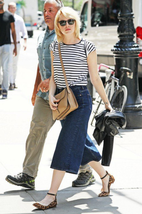Đầu tiên, hãy xem Emma Stone đã khiến từ khóa jeans culottes (quần culottes vải bò) trở lại hot thế nào trên các trang báo và diễn đàn của các tín đồ thời trang. Nó làm chúng ta nhớ lại những chiếc quần culottes lửng lơ từng làm mưa gió mùa hè năm trước và nhớ ra rằng vẫn còn một lựa chọn cực kì "cool" để mặc quần jeans hè này. Không nhất thiết phải là quần jeans dáng dài dài và nóng bức, một chiếc quần culottes với chất vải này vẫn đủ sức làm bạn trở nên yêu kiều và năng động trong những ngày nắng.