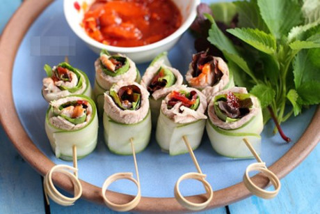 Cuối cùng bạn khéo léo cuộn thịt bao lấy rau, sau đó cuộn một lát dưa leo bên ngoài rồi dùng que xiên để cố định lại.