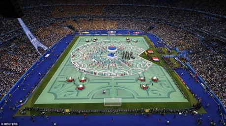 Bữa tiệc âm nhạc ở Stade de France được tiếp nối bởi hình ảnh chiếc tháp Eiffel khổng lồ được dựng lên trước lúc đội bay trình diễn của không lực Pháp vẽ lên nền trời những cột khói mô tả các màu xanh, trắng và đỏ của quốc kỳ nước chủ nhà.