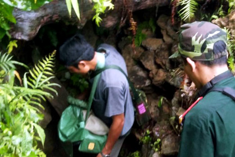 15h, trời ngớt mưa, công tác cứu hộ lại được tiếp tục. Có 4 người đàn ông gồm của Binh chủng Hóa học Bộ Quốc phòng cùng dân địa phương đi xuống hang.