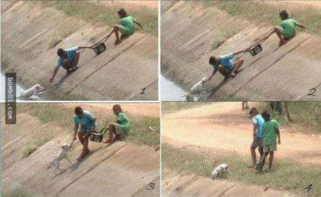 Hai em nhỏ cứu vớt chú chó con bị rơi xuống nước. Đây là một trong những bức ảnh gây xúc động về "tình người và chó".
